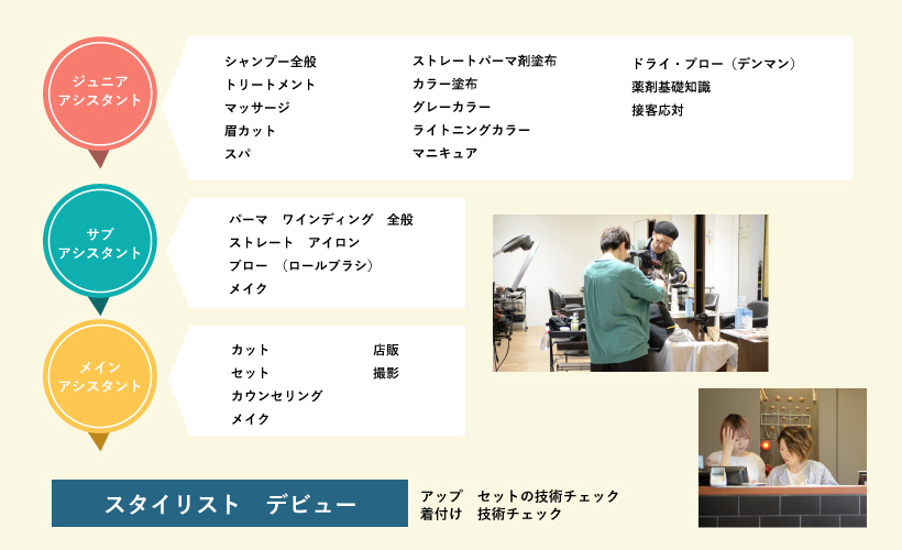 キャリアパスプランによって、自分の成長を実感しやすい環境です。 また、 できる技術が増えるごとにお給料もアップするので、モチベーションもアップ!個人店のため1人ひとりに合わせてキャリアパスプランを柔軟に変更できるところも魅力です。 苦手なところや、のばしたいところを重点的に学ぶこともできます。 自分の個性をのびのびと伸ばし、デビューしてすぐ売れっ子美容師に なるのも夢ではありません。